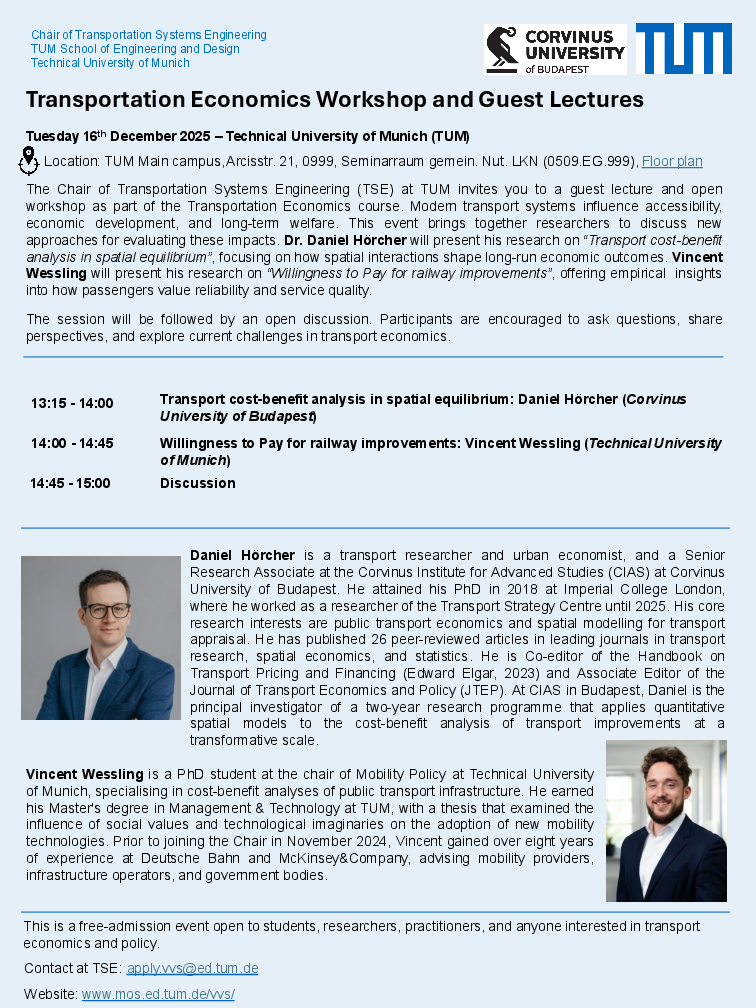 The Chair of Transportation Systems Engineering (TSE) would like to invite you to an open workshop with two guest lectures as part of our course on Transportation Economics at the Technical University of Munich main campus on Tuesday, 16 December 2025.