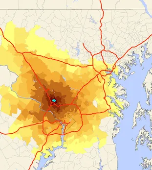 When households look for a new housing location, the job locations of all household members are taken into account. As SILO is designed as a microsimulation, the work locations of all household members are known. The left map in Figure 4 shows an example of a work location in North Bethesda, MD (turquoise dot). The trip length frequency distribution in minutes is used to estimate the utility in terms of commute distance for every zone (shown in brown-to-yellow colors).